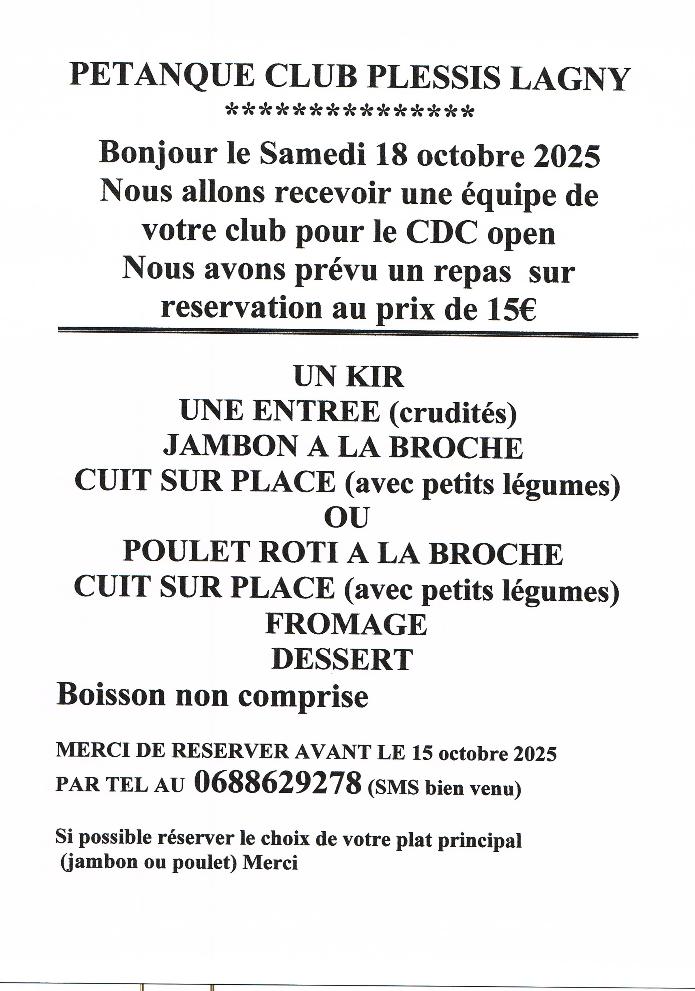 - 10/10/2025 PLESSIS-LAGNY : Affiche réservation repas pour le CDC du 18 Octobre