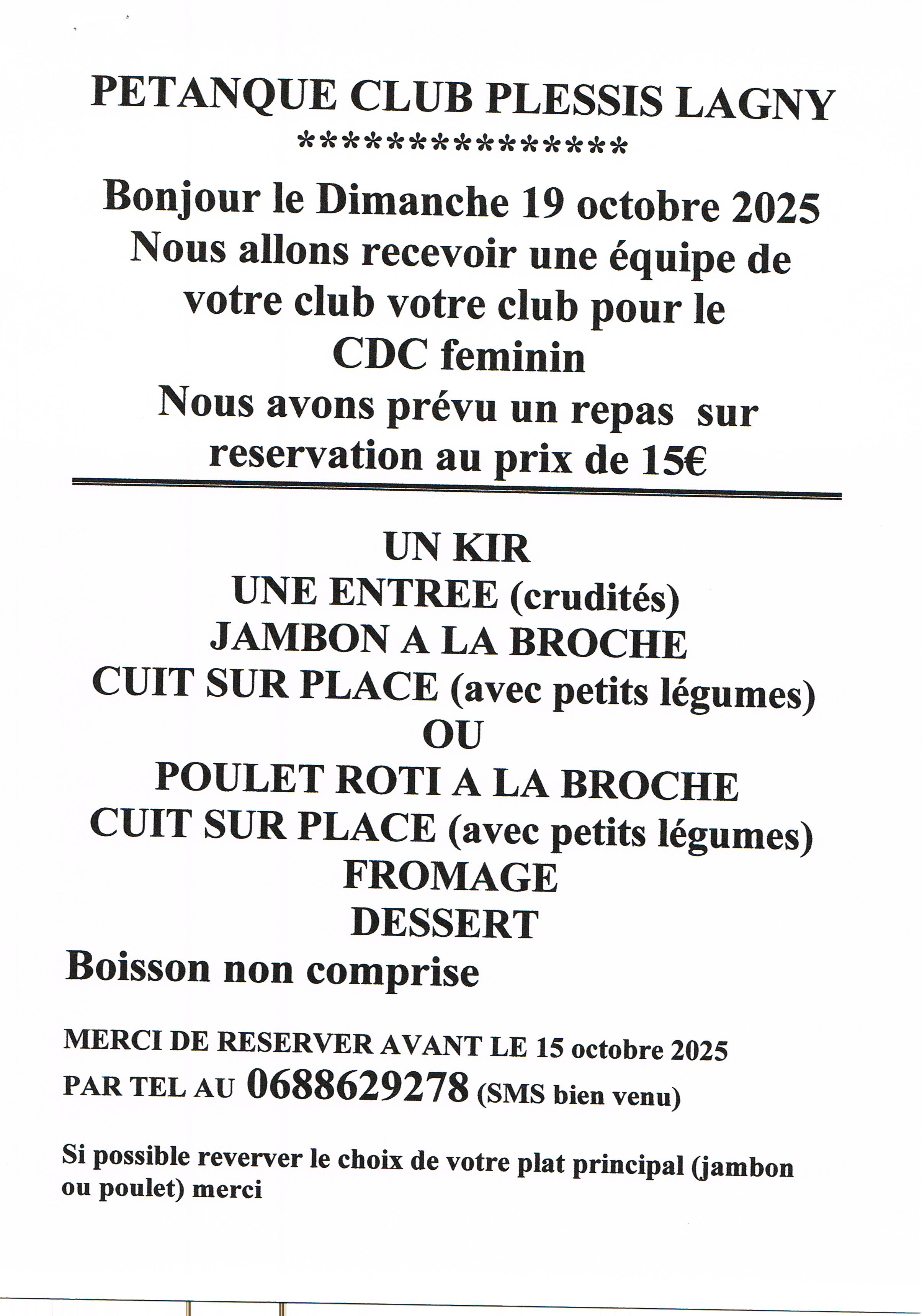 - 06/10/2025 PLESSIS-LAGNY : Affiche réservation repas pour le CDC Féminin du 19 Octobre